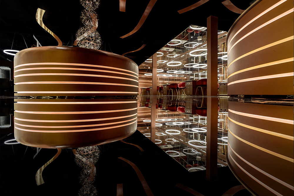 为了呈现空间平行的倒影效果,运用镜面反射效果的黑色镜面地砖、银色镜面不锈钢、水波纹不锈钢等材料。再加上灯光颜色的融入,营造出一个流光溢彩的倒影平行空间 ,实景与倒影一实一虚,遥相辉映,极大提高了整个空间纵深感与视觉冲击力。