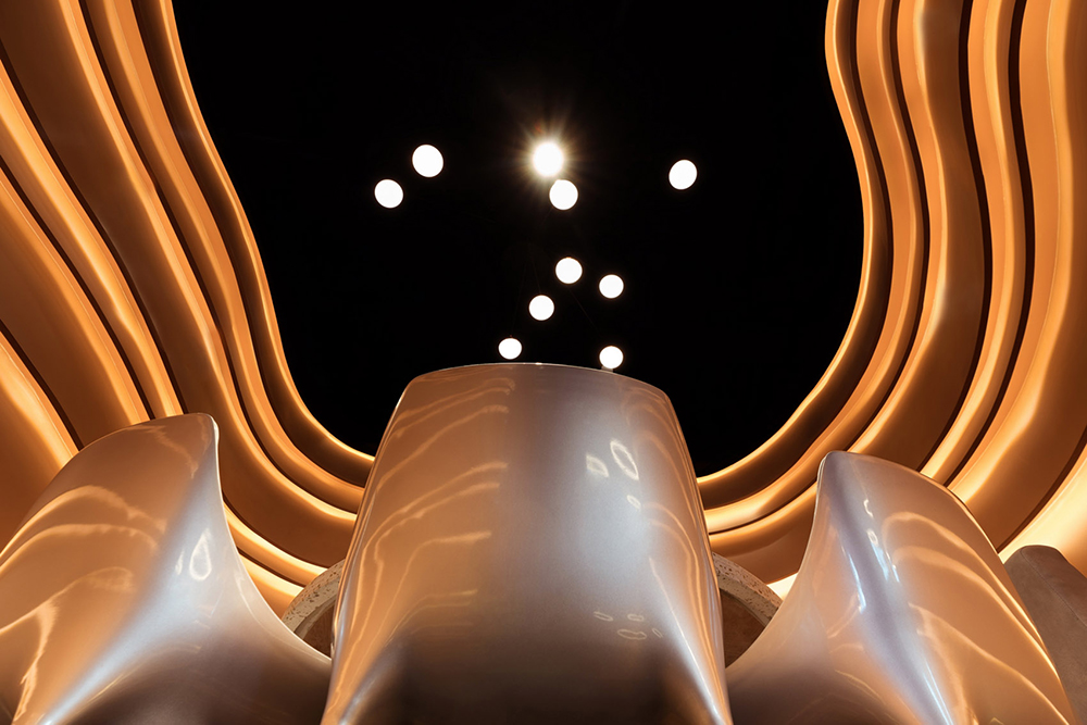 设计中使用大量行云流水、层次分明的曲线造型线条,强烈的解构主义美学,打破固化的方正、有序的格局,以柔中带刚的曲线展示未来感。