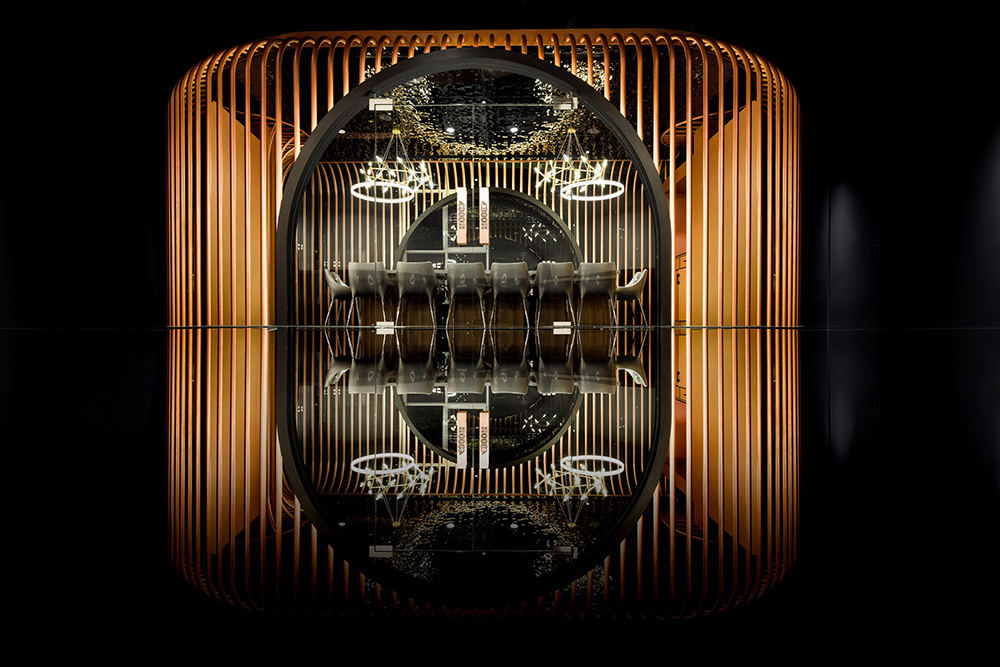 大厅是空间重要的形象,从店外乘坐电梯进入到6米高度的餐厅艺术大厅,电梯门被打开的瞬间,恍惚中进入到另一时空,一种酷炫有趣的光影空间。天花顶上的几何面银色镜面不锈钢造型,与弧形造型墙面错落有致的线条,及雅致黑色镜面的瓷砖,呈现出一种相得益彰的极美画面。