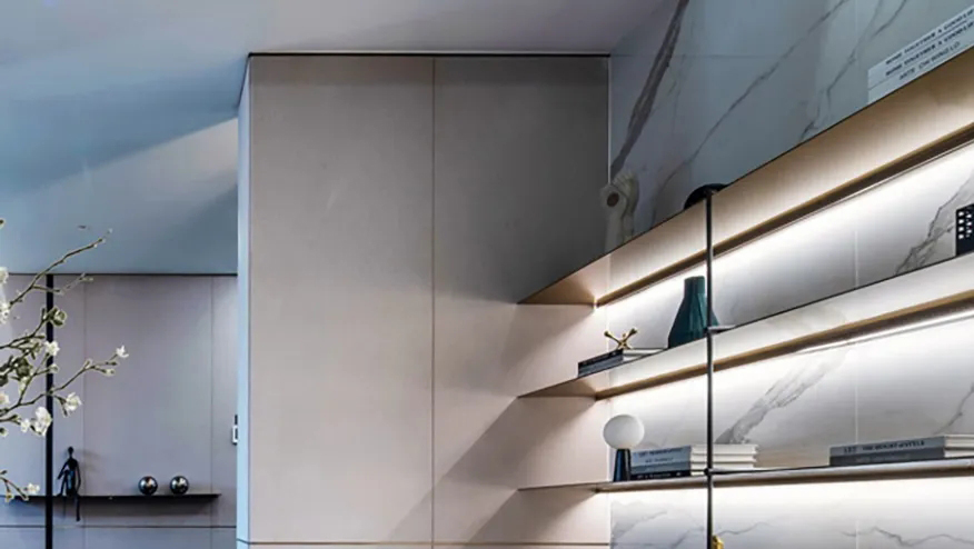 书柜设计在转弯处,巧妙的演绎了“转角遇到爱”。金属壁龛书柜内添加灯带的设计将金属的光泽更好的展现出来,同时在空间里展示优雅与奢侈的韵味。