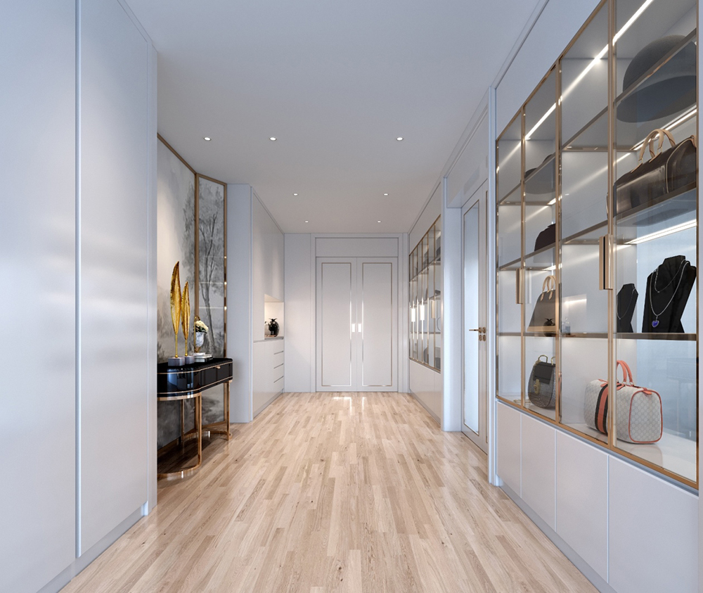 衣帽间叙事与其它空间一脉相承,纯粹、精致、大气、自在。无论是线条干净利落的落笔,还是灰白平顺温和的渲染,都给人以一种宁静优雅的感觉。卧室,最好的姿态,是要让人放松下来。整个空间予人温柔舒适之感,继而在冬日的暖阳或夏季的清晨,肌肤触碰到柔软丝绸,脚尖接触到温暖的地板,走向迎面落地窗,伸个懒腰,开始完美一天;夜晚望着城市的夜空,享受人生最曼妙的风景。