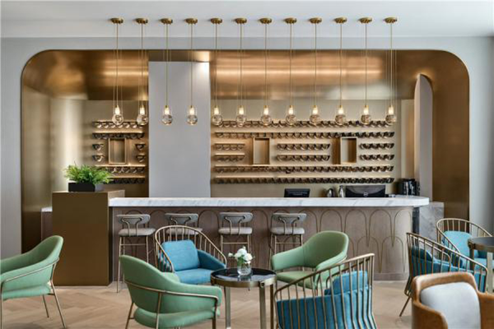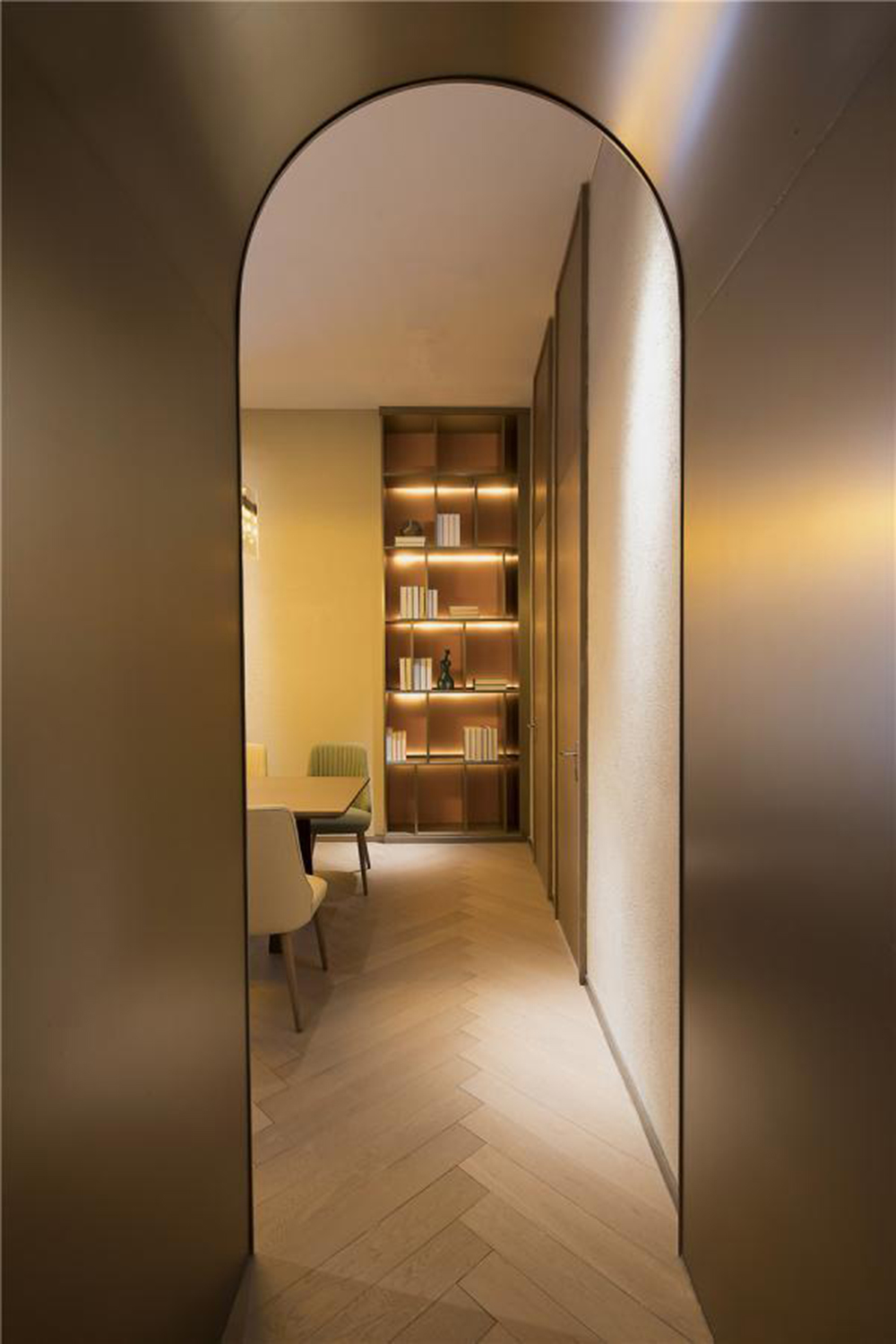 随处可见的抽象语言——颜色和几何图形,复古的古铜色不锈钢,通过不同的组合使用,营造出设计师想要体现的氛围,浪漫、优雅而出其不意。