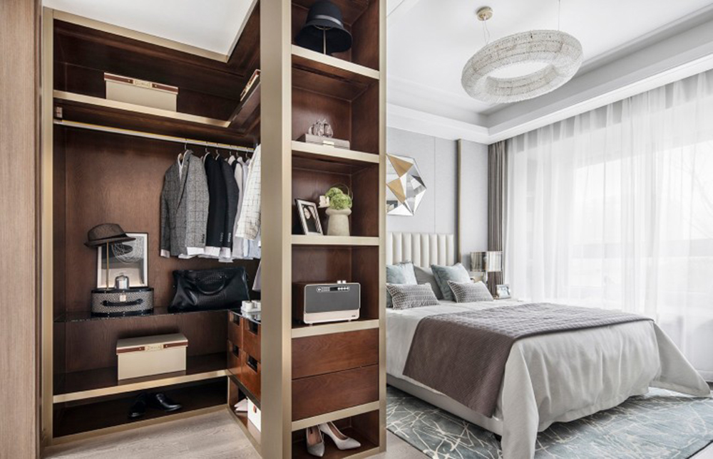 卧室的设计延续空间的整体风格,以艺术轻奢为基调,以暖灰搭配棕咖色打造宁静雅致的休憩空间体验。次卧的设计搭配灯具与艺术挂画的的金属、玻璃等材质,让空间带有一种恰到好处的温柔轻奢感,整个空间在光影中温和地“互渗”,形成一种平衡优雅的艺术美感。